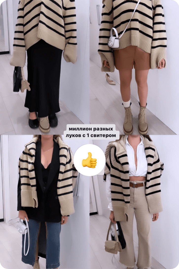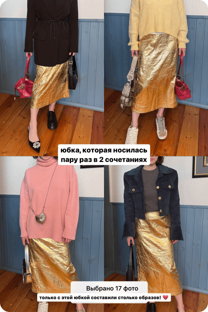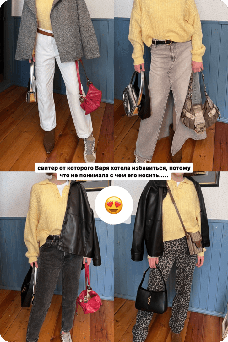 Вроде из тех же самых вещей луки составляю, а мне на работе коллеги говорят «боюсь представить, сколько ты тратишь на вещи в месяц, у тебя наверно гардероб огромный», а по факту это просто сочетания от тебя!!